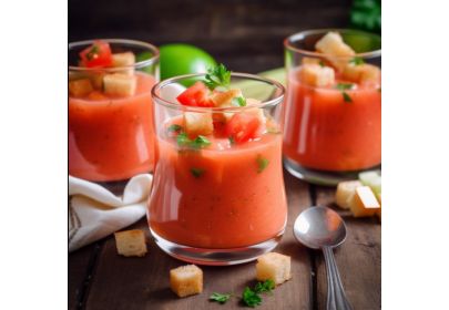 Recette d'un Gaspacho de tomates rafraîchissantLire la suiteComme vous le savez le gaspacho de tomates est une soupe froide emblématique de la cuisine espagnole, parfaite pour les journées estivales, plat que l'on retrouve maintenant dans beaucoup de pays vu son côté rafraichissant et gourmand. Cette recette vous transportera directement en Espagne avec ses saveurs vives, sa fraîcheur et sa simplicité. Préparé à base de tomates mûres, de légumes frais et d'épices aromatiques, ce gazpacho est un véritable régal pour les sens.