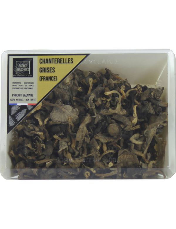 Barquette de chanterelles grises séchées Origine France - Poids net 40 g - Conservation longue durée - Produit sujet à dessication - Conditionné en France