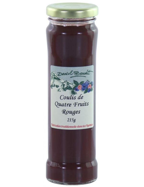Ce coulis de quatre fruits rouges fait partie de la gamme de Daniel Boudet, fondateur de Confiture des Pyrénées à qui il a légué tout son savoir faire et tous ses secrets utiles à la préparation de ces coulis au goût unique. Un savoir-faire qui permet de mettre en avant la qualité de ces coulis de fruits naturels et délicieux.