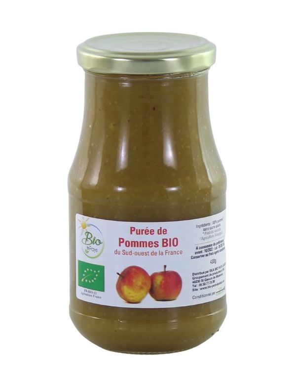 Purée de pomme Bio proposée en pot en verre de 430 g - Conservation longue durée - À conserver au frais après ouverture et à consommer rapidement.