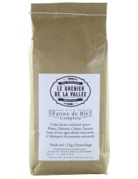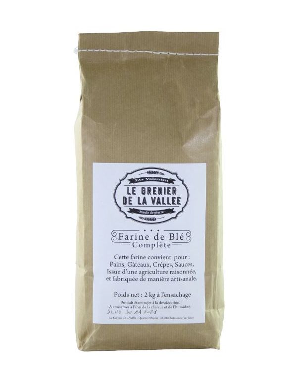 Nous vous proposons ici un sachet de 2 kg de farine de blé complète. Cette farine est réalisée avec du blé issu d'une agriculture raisonnée dans l'Est de la France, il s'agit par ailleurs d'une farine artisanale 100 % origine France puisque le blé est moulu sur meule de pierre juste à côté de son lieu de production, à Chateauneuf sur Isère.