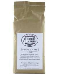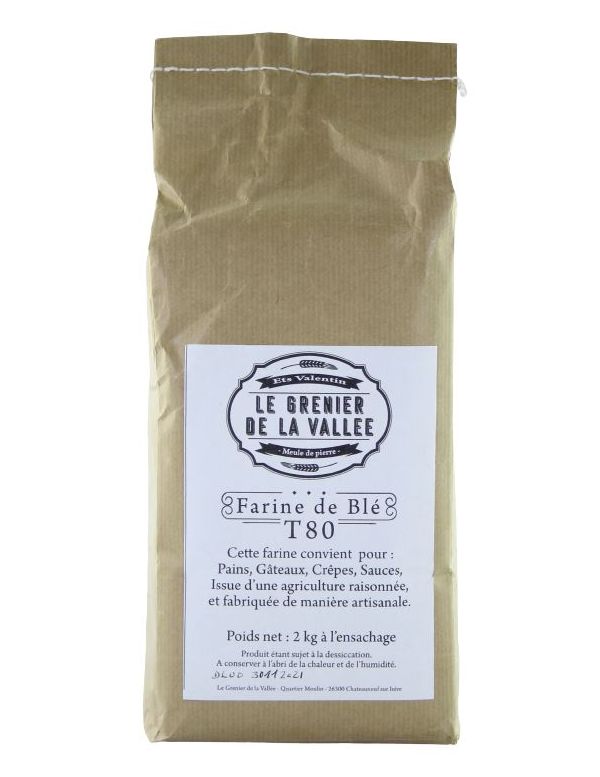 Nous vous proposons ici un sachet de 2 kg de farine de blé T80. Cette farine est réalisée avec du blé issu d'une agriculture raisonnée dans l'Est de la France, il s'agit par ailleurs d'une farine artisanale 100 % origine France puisque le blé est moulu sur meule de pierre juste à côté de son lieu de production, à Châteauneuf sur Isère.