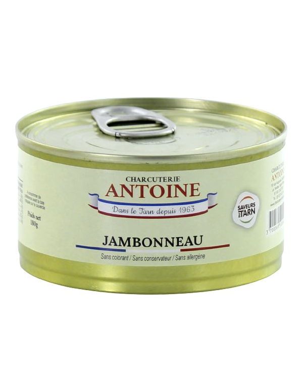 Retrouvez ici le jambonneau en conserve de la Charcuterie Antoine. Un jambonneau de qualité préparé traditionnellement avec un jarret de porc issu de porc français, nés et élevés en France.