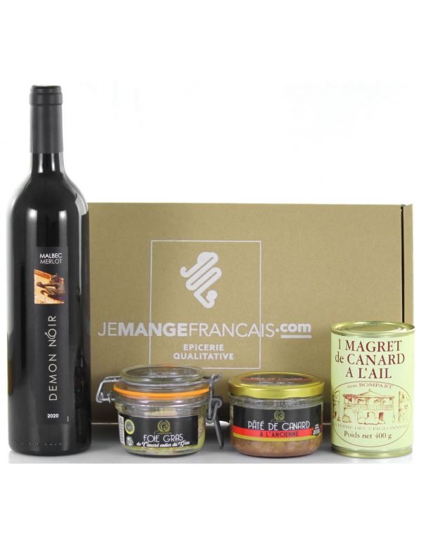 Le Coffret cadeau de produits du terroir autour du canard est une sélection de spécialités du Sud-Ouest, incluant un foie gras IGP Gers, un pâté de canard nature, un magret de canard à l'ail et un vin rouge Démon noir.