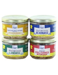 Tous les amateurs de bonnes charcuteries vont se régaler avec cet assortiment de 4 pâtés au goût authentique fabriqués artisanalement à partir de viande de porc et de canard élevés en France. Retrouverez ci-dessous les 4 pâtés du lot découverte :