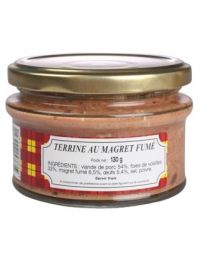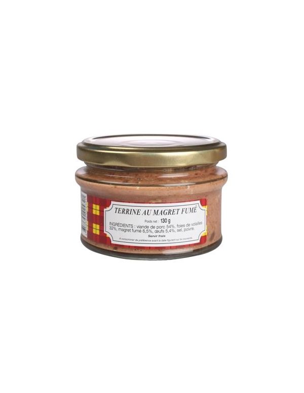 Élaborée traditionnellement dans le Tarn, cette terrine de campagne est réalisée à partir de viande de porc origine France et de foies de volailles frais agrémentés de morceaux de magret fumé de canard origine Gers.