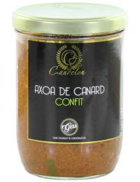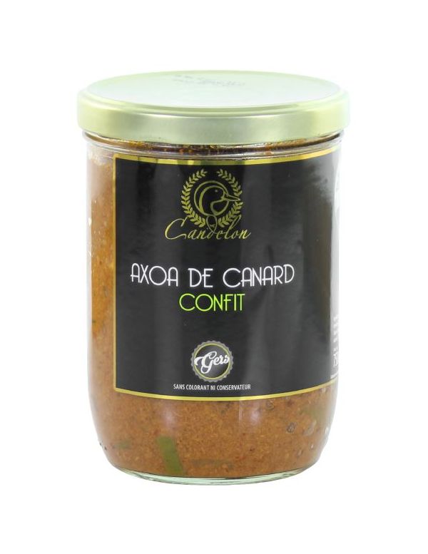 L'axoa est un plat typique du Pays Basque qui à l'origine se composait de veau avec une sauce relevée et pimentée au piment d'Espelette. Nous avons le plaisir de notre côté de vous proposer un axoa de canard confit qui a été préparé selon les recettes traditionnelles mais avec du canard confit ce qui procure un résultat aux saveurs gastronomiques indiscutables.