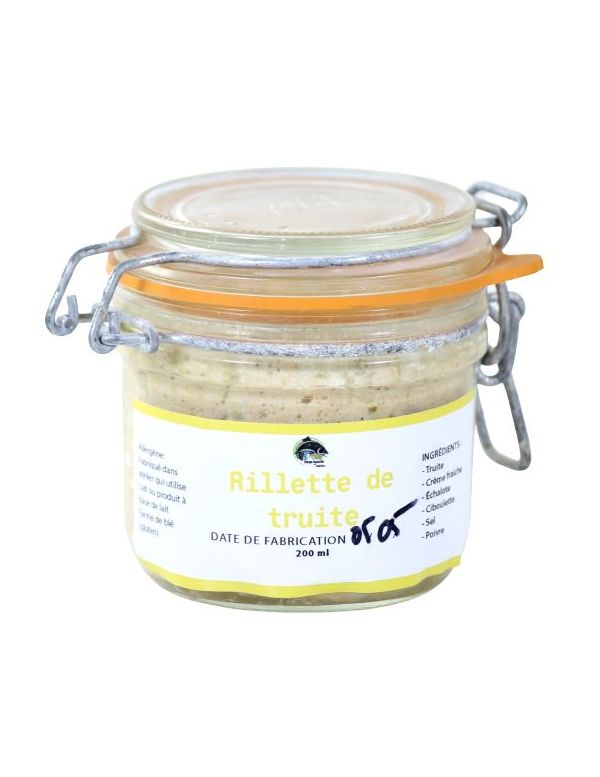 Ces rillettes artisanales de truite sont élaborées avec la chair, et uniquement la chair, de truites arc-en-ciel fraîches. Cette chair est cuite au cours bouillon avant d'être hachée manuellement à la fourchette pour vous garantir un produit à la texture onctueuse.