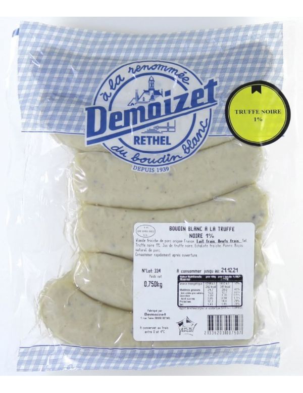 Il s'agit d'un boudin blanc truffé de grande qualité élaboré artisanalement à Rethel à partir de poitrine de porc origine France, de lait frais ardennais et d’œufs entiers français. Un boudin blanc incomparable et rendu unique de par ses subtiles saveurs gastronomiques de truffe noire.