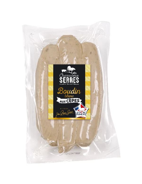 Boudin blanc aux cèpes protégé par le label "Le Porc Français" - Conservation au frais température inférieure à 3 °C.