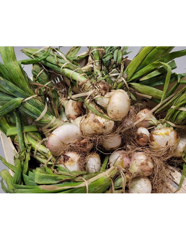 Oignon frais en botte de 580 g environ (+/- 30 grammes) vendu à l'unité - Cultivé en France - L'expédition se fait dans un sachet kraft recyclé.