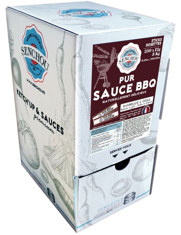 Associant la quantité avec la qualité, ce carton distributeur propose un service de 250 sticks de sauce BBQ dont la recette naturelle à base de tomate, d'oignon et d'épices fabriqué en France nous offre une sauce barbecue d'exception. C'est le pari réussi de proposer 250 dosettes de sauce burger tout en conservant la qualité d'une bonne sauce BBQ aux saveurs authentiques.