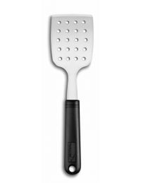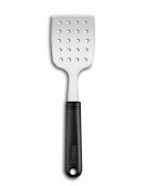 Cette spatule à trou professionnelle est fabriquée en acier inoxydable pour garantir un outil de cuisine qualitatif aux finitions soignées. Elle permet de prendre et servir vos aliments en toute aisance grâce à son extrémité en biseau non-agressif et permet d'évacuer les jus et liquides excédents grâce à ses petits trous.