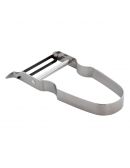 La forme et ses légers enfoncements situés de chaque coté de ce rasoir à légumes en inox de qualité professionnelle permettent une ergonomie parfaite, facilitant la prise en main pour cuisiner en toute sécurité. De plus, l'ergot en inox de cet éplucheur à légumes en inox vous permet de retirer les bout abimés de vos légumes.