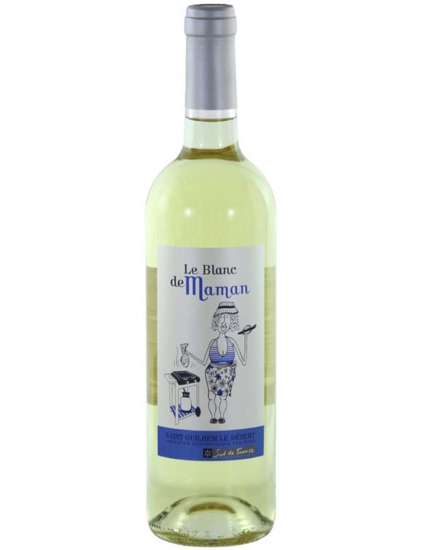 Sublime touche humoristique avec cette étiquette de vin façon BD où l'on voit une dame faire griller son poisson, "Le Blanc de Maman"... en tout bien tout honneur était le nom que devait porter ce vin blanc qui est un vin léger très aromatique. De plus ce vin blanc est protégé par l'IGP Saint Guilhem Le Désert propre au Languedoc Roussillon. Il fait aussi partie des vins labellisés Sud De France.