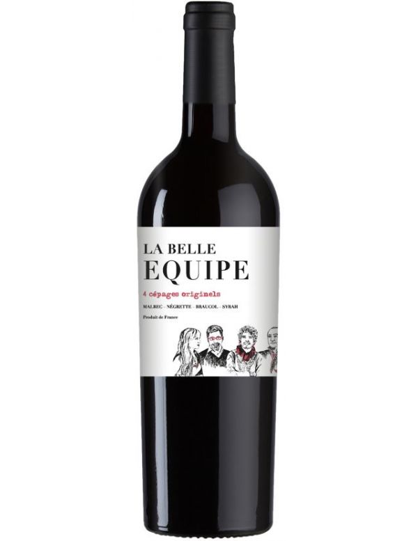 "La Belle Equipe" c'est l'histoire de 4 œnologues (que l'on voit illustrés sur l'étiquette) ayant mis en commun leur passion pour leur terroir, leur cépage et leurs savoir-faire pour créer un vin de France qualitatif. C'est une cuvée unique, fruit de l'assemblage de 4 cépages originels propres à l'identité de leurs terroirs respectifs : Négrette, Braucol, Malbec et Syrah, chacun dévoile ainsi un bout de son vignoble dans cet excellent vin rouge.